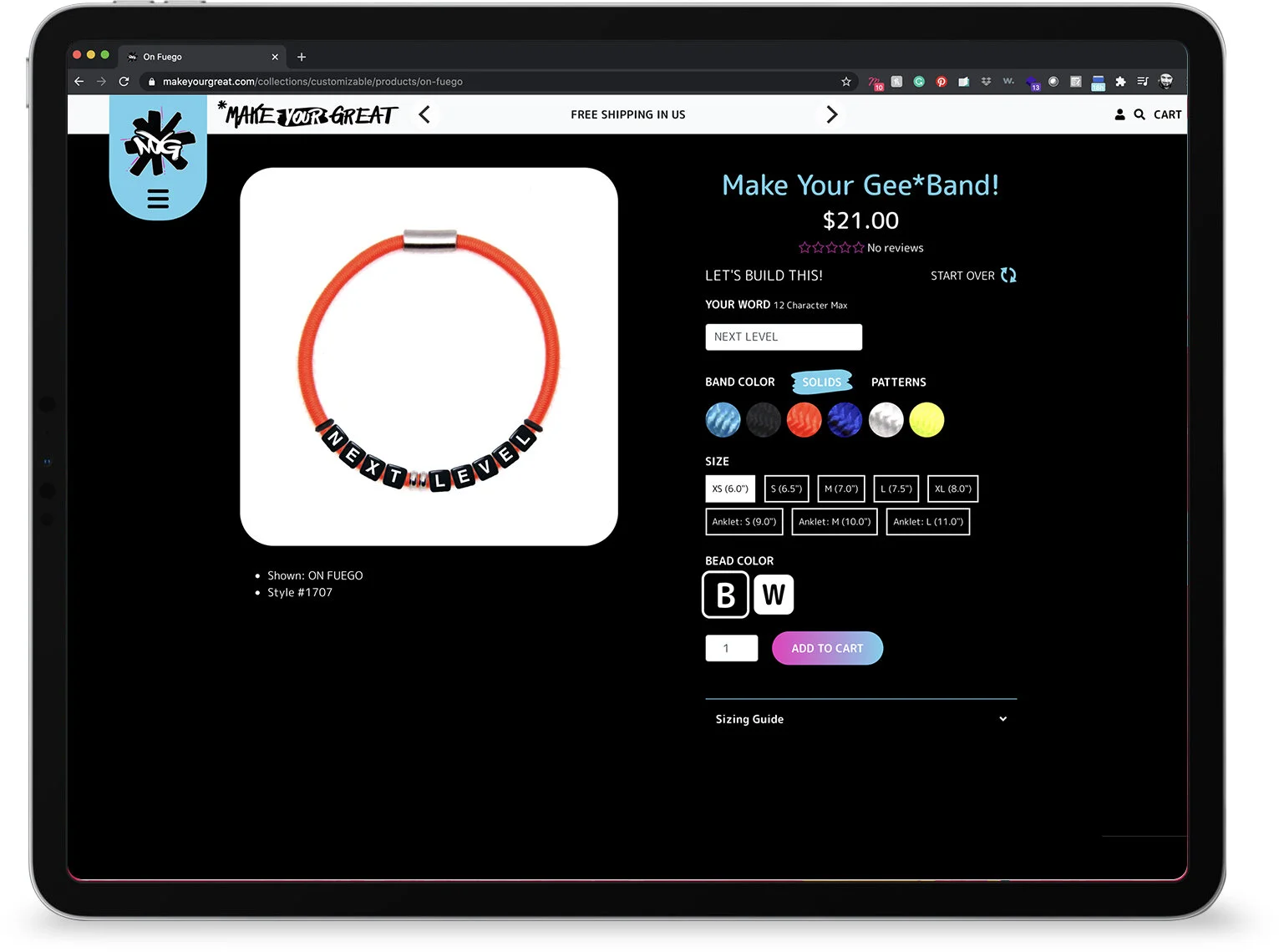 MAKE YOUR GREAT (MYG) is a vibrant yet durable band that consumers can customize to fit their lifestyle. Unlike most bands/bracelets, the proprietary GEE*BAND™ was made from a durable, washable, rot-resistant material. So, like our consumers, it could go anywhere their passions took them.